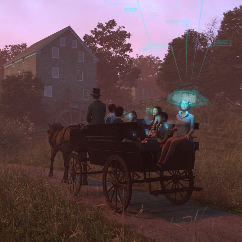 “I’m gonna…find a washroom,” said Amanda, slipping away from the group. She didn’t want lunch. She was hot and nauseated and tired and depressed. But the farther she got from Beatrice, the better she felt. She had an urge to return to the 1990s living room, but there’d be nothing to see without her iEye. She headed instead toward the mill. That had been her favourite building when she was little. She’d like to watch the big water-wheel turn. As she passed the old–fashioned general store, another group of schoolchildren spilled out across the pathway. Amanda veered onto the lawn of the doctor’s house to avoid them. She cut through the back garden — marigolds, runner beans, tufts of lettuce in neat rows — and exited through a rear gate into a field that led down to the mill.